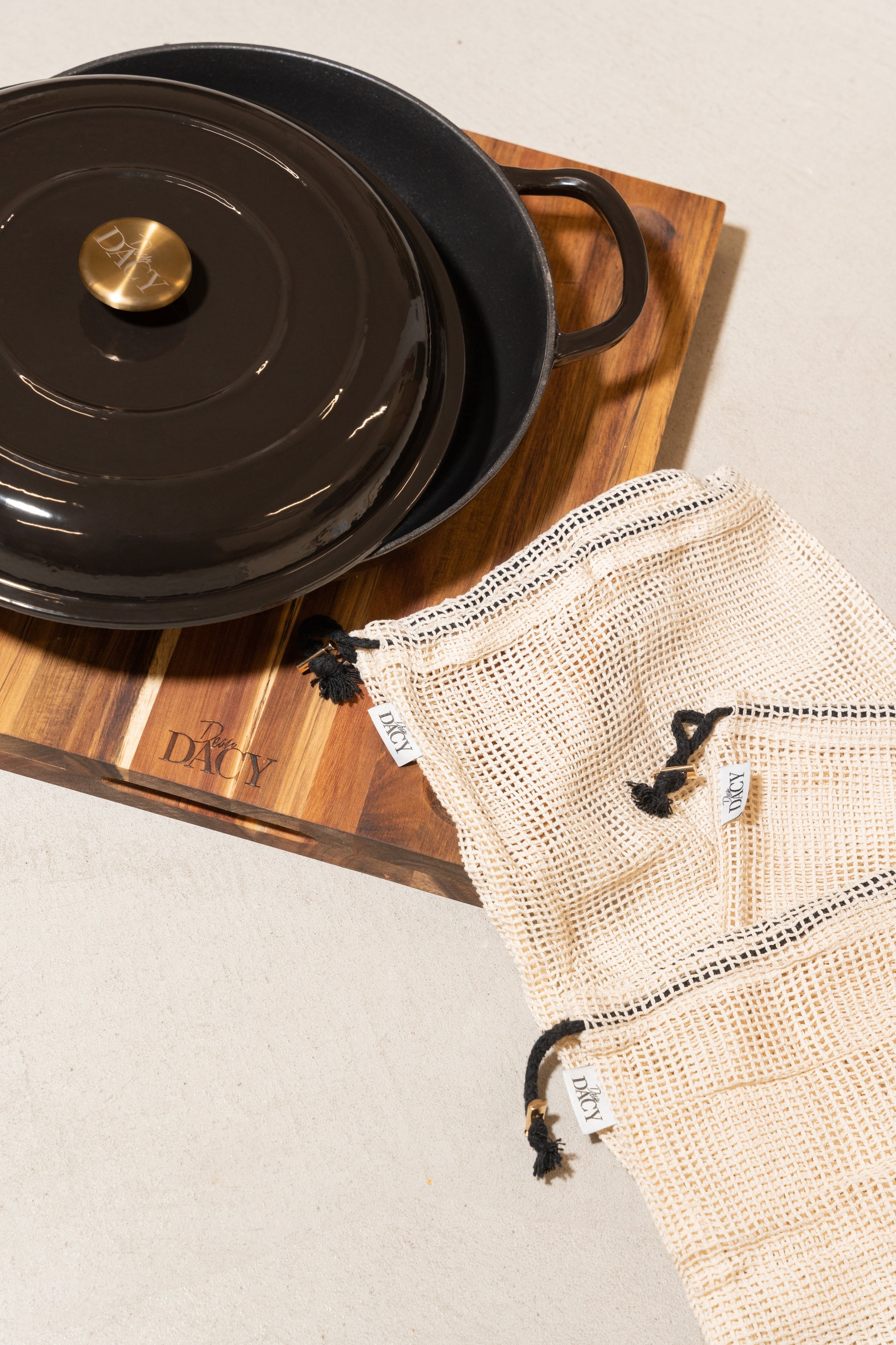 Includes ONE of each Dear Dacy Casserole Braiser Pan, Acacia Wood Cutting Board and a 3pack of Organic Produce Bags.