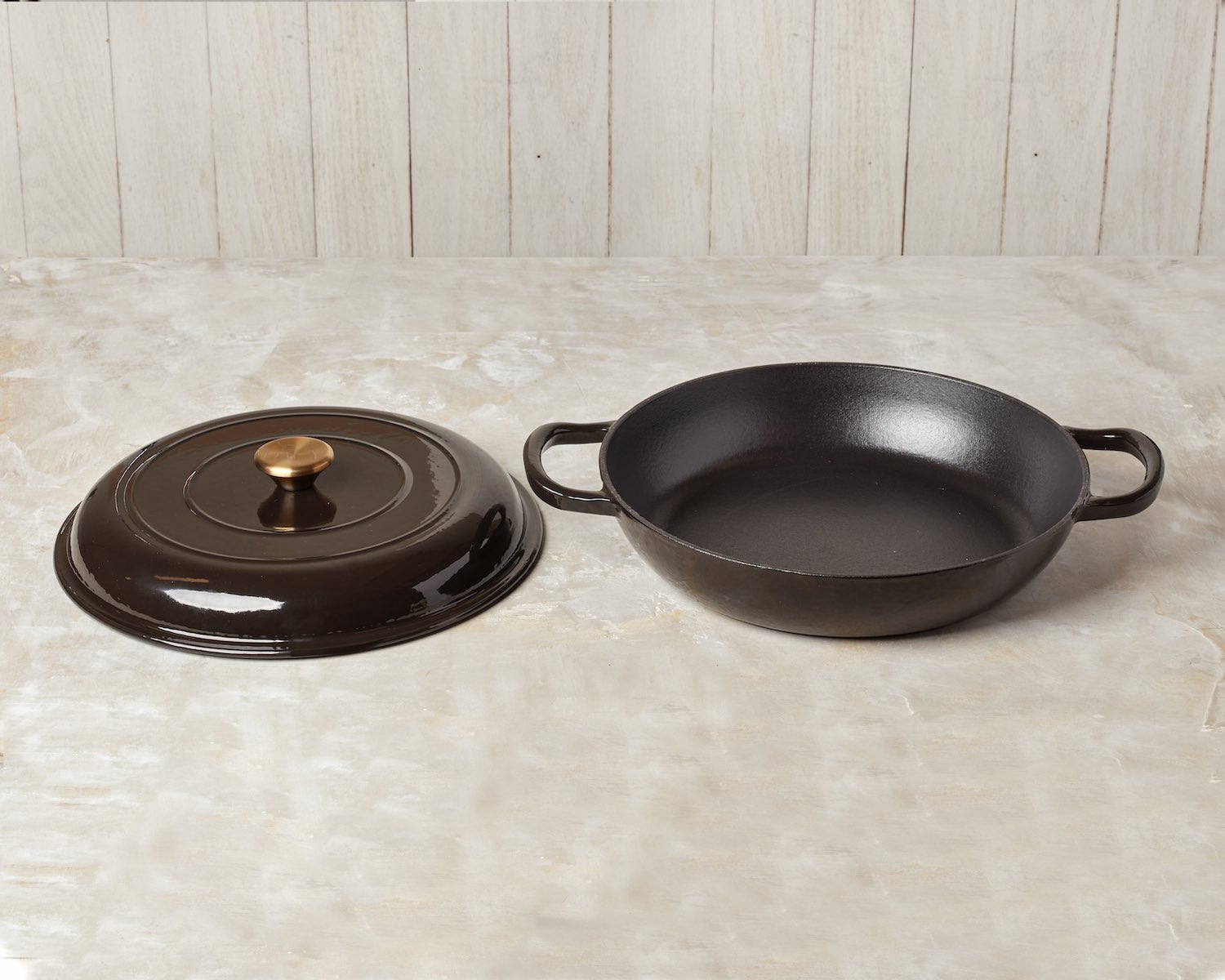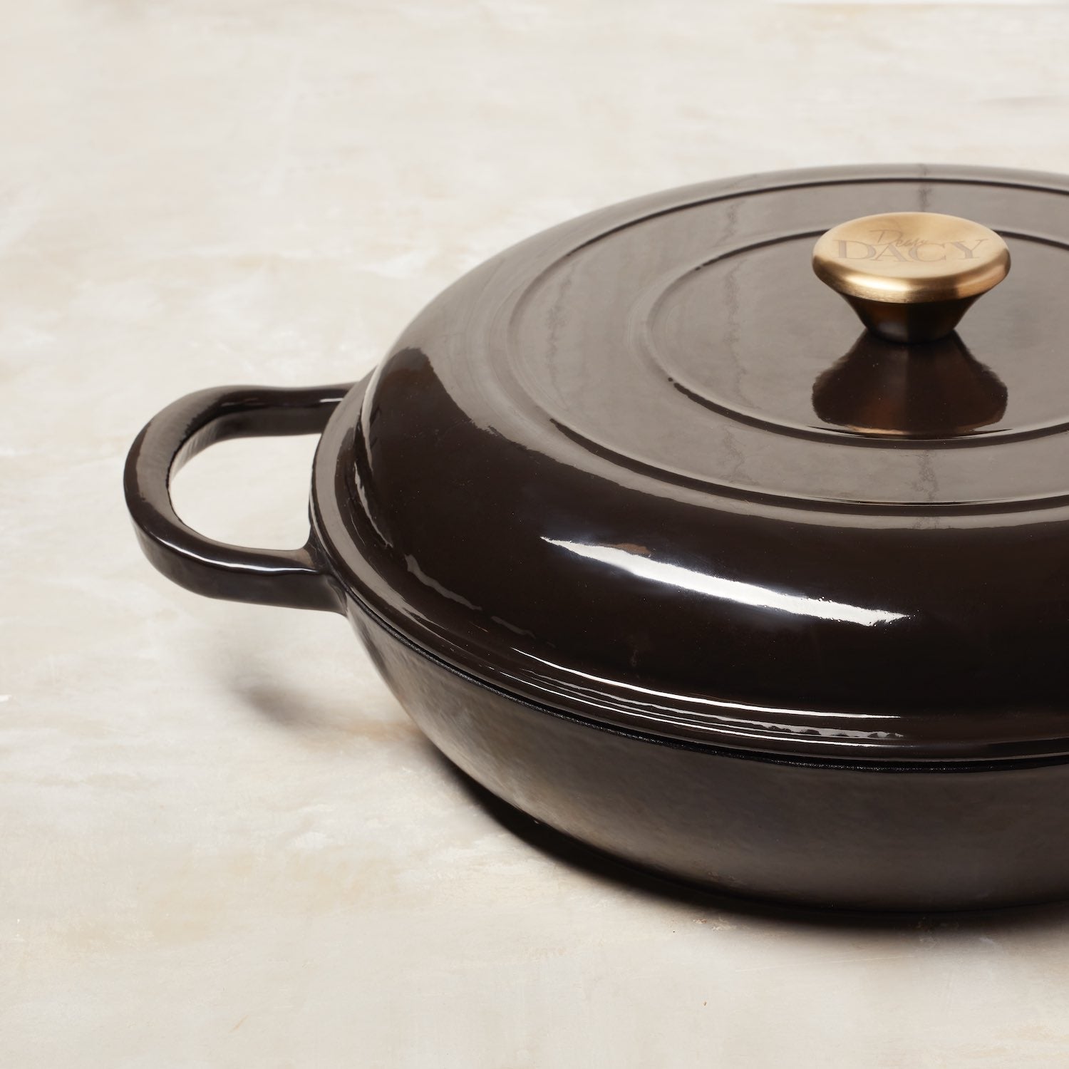The Dear Dacy Casserole Braiser Pan has a black scratch-resistant porcelain enamel exterior with a gold stainless steel knob and heavy cast iron interior.